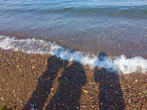 阳光打在海浪上,海浪打在我们仨的影子上~