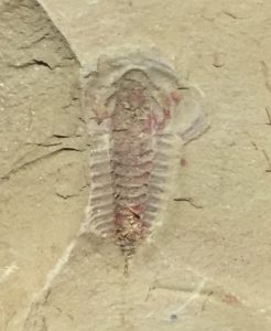 和化石的缘分得从今年三月份说起。以志愿者身份参加在地(位于昆明的一家自然教育机构)地质时光机的一堂课。课堂的主要内容是去昆明周边一个小山头找化石。半夏是那堂课讲地质和古生物的老师。那儿有很多页岩碎片,随便一找就能发现类似三叶虫头甲、贝壳类等的化石。在即将结束寻找的时候,我发现一块完整的三叶虫幼虫化石(下图)。半夏告诉我这是满苏氏莱德利基虫。那是我第一次发现那么多化石,也是第一次在野外自己找到完整的三叶虫化石,才知道原来化石并没有想像中稀少。