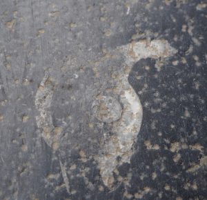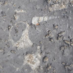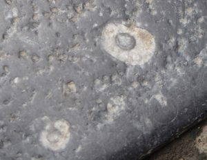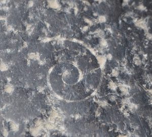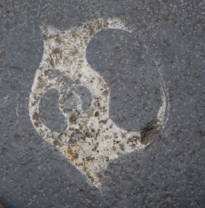 10月再次来到昆明。某次在街上闲逛的时候,低头一看,竟然又是满地的化石!要知道,这些化石就在市中心铺人行道的石头上!每天来来往往那么多人踩在它们上面,使化石风化严重,许多难以辨认种类。人群川流不息,又有多少人留心过这些黑色石头上的白色印迹呢?